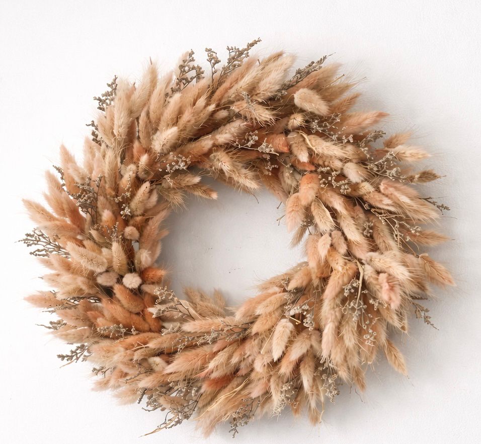 Wianek wykonany z suszonego dmuszka z dodatkiem limonium w odcieniach beżu.
